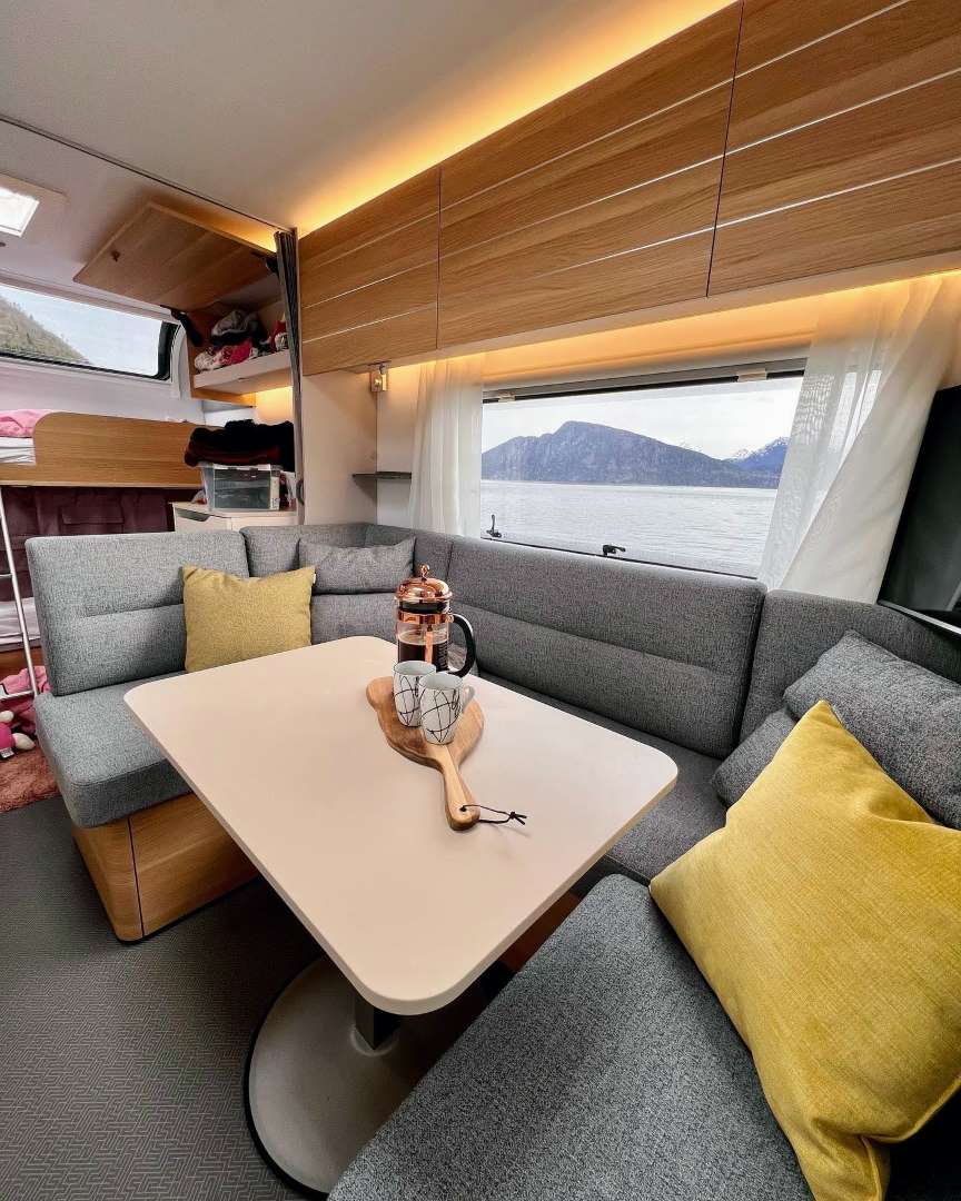 I midten af campingvognen finder du en rummelig dinette med komfortable sæder og et elegant, moderne køkken. Dinetten er perfekt til en familie med to børn.